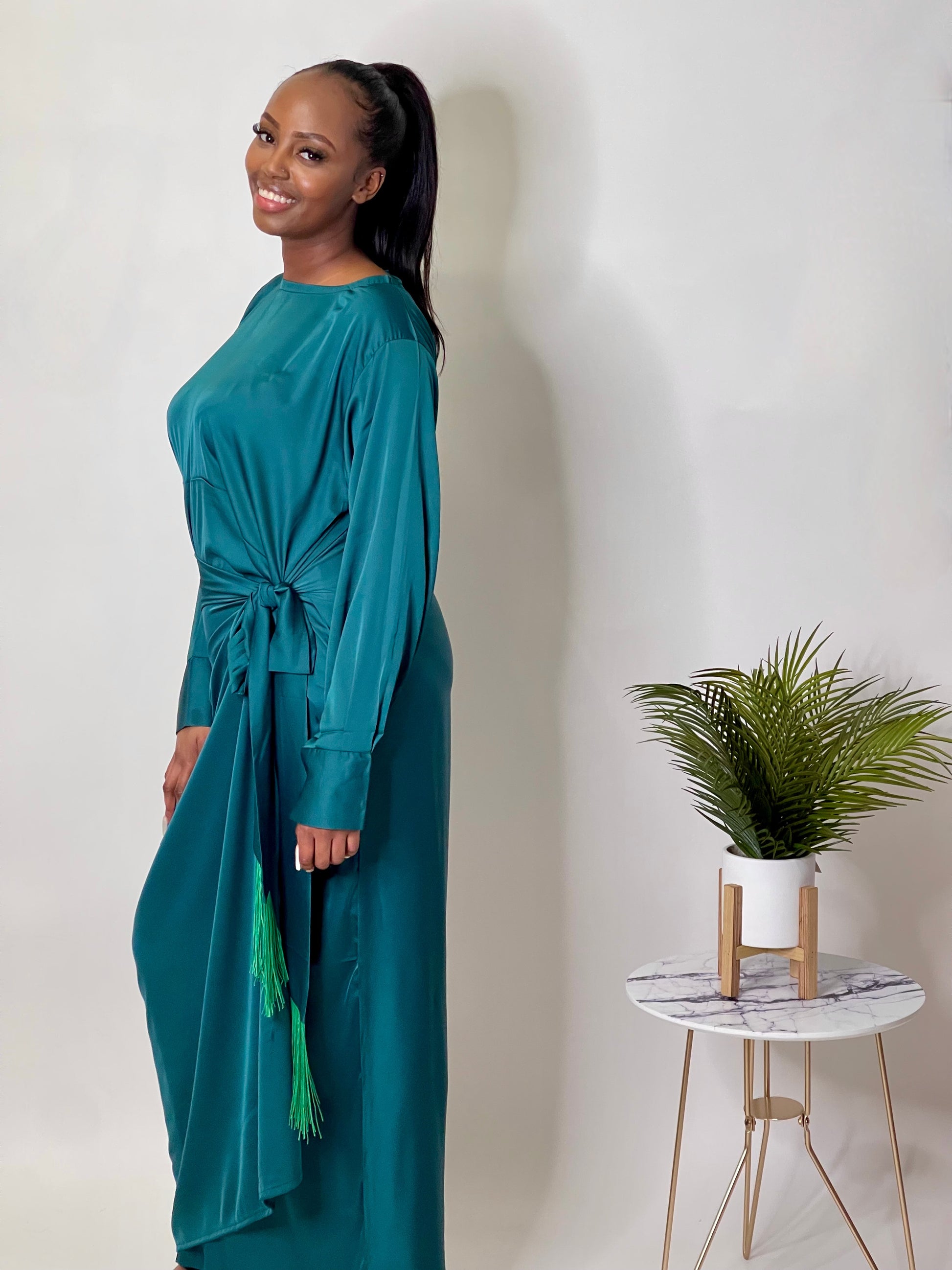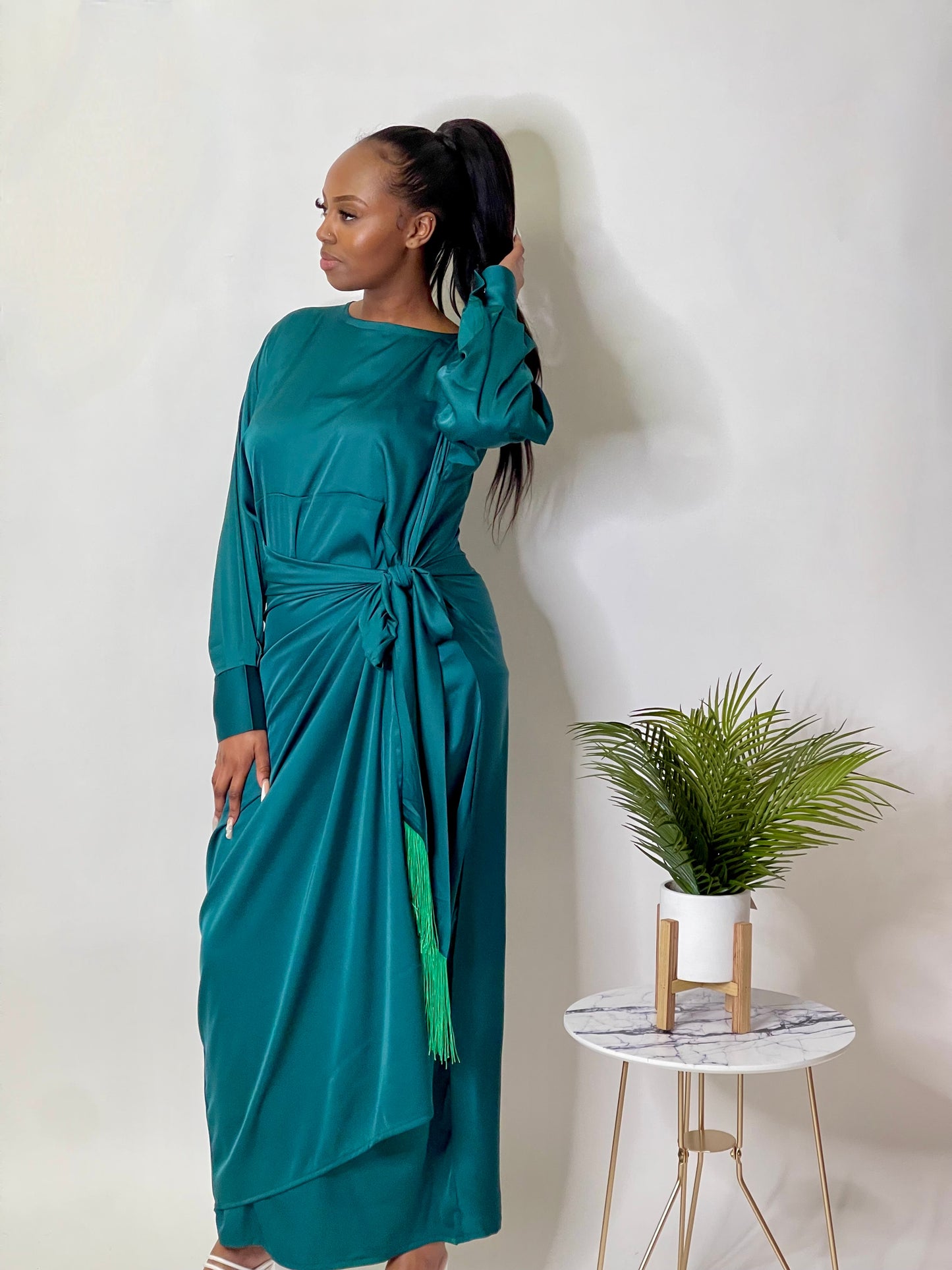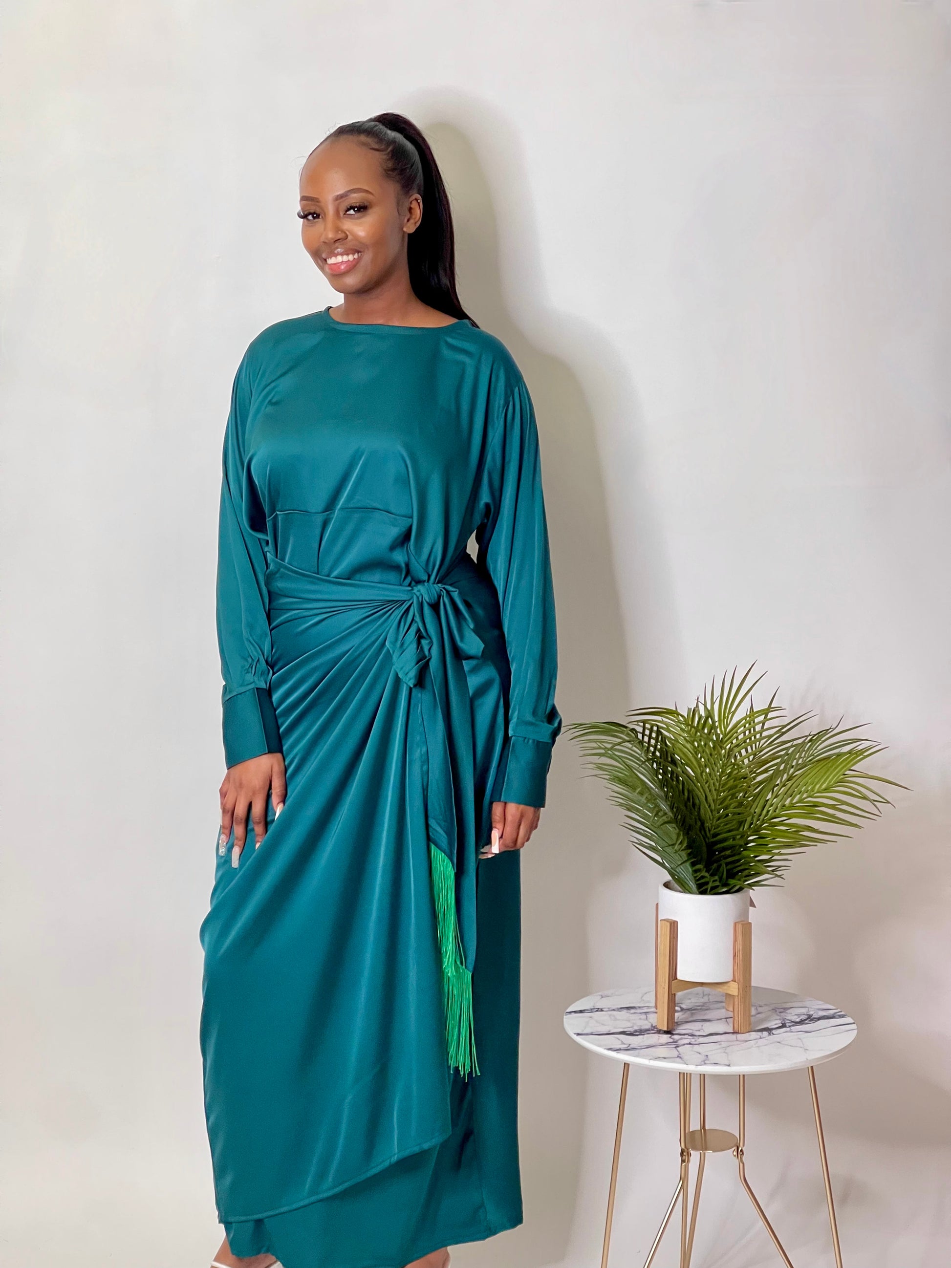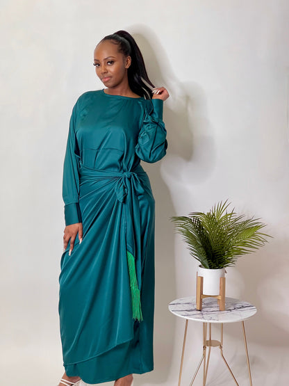 Modest satin wrap dress perfect for any occasion, whether thats a boujee dinner party or date night.