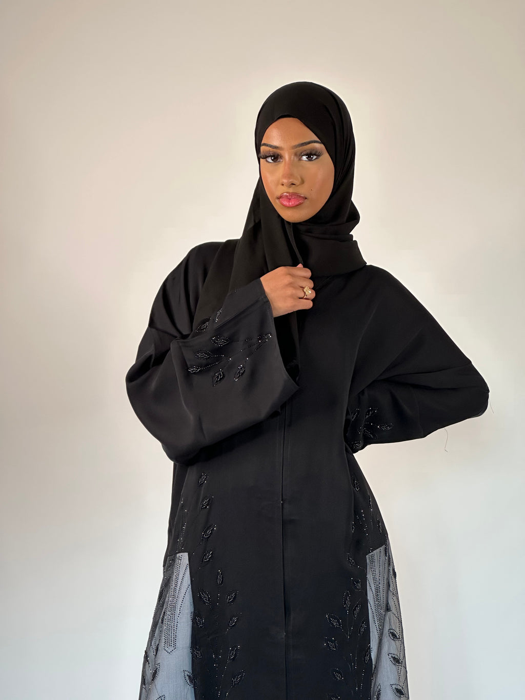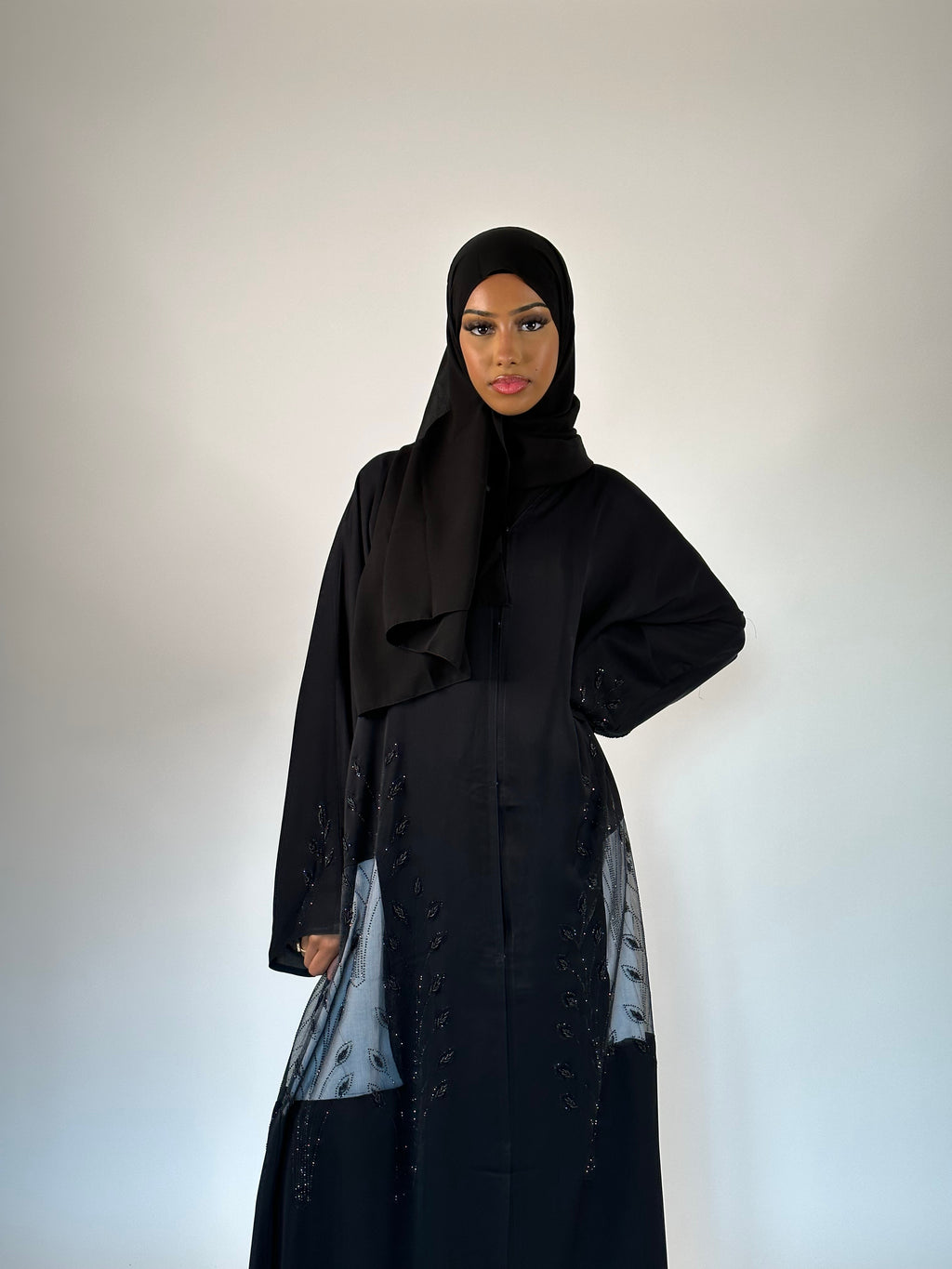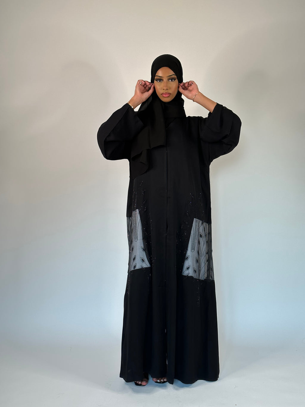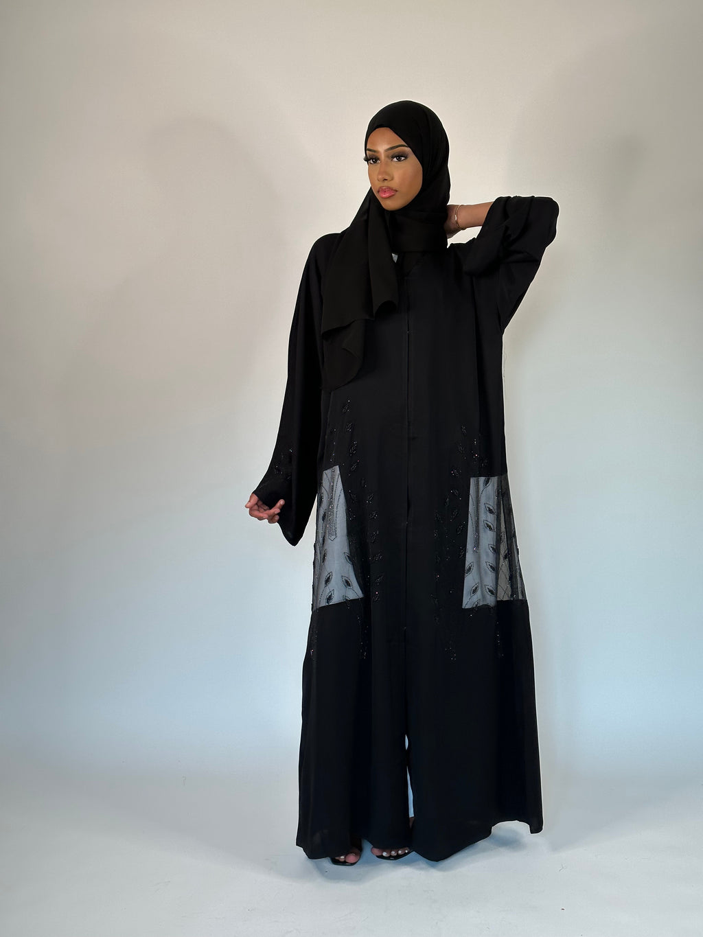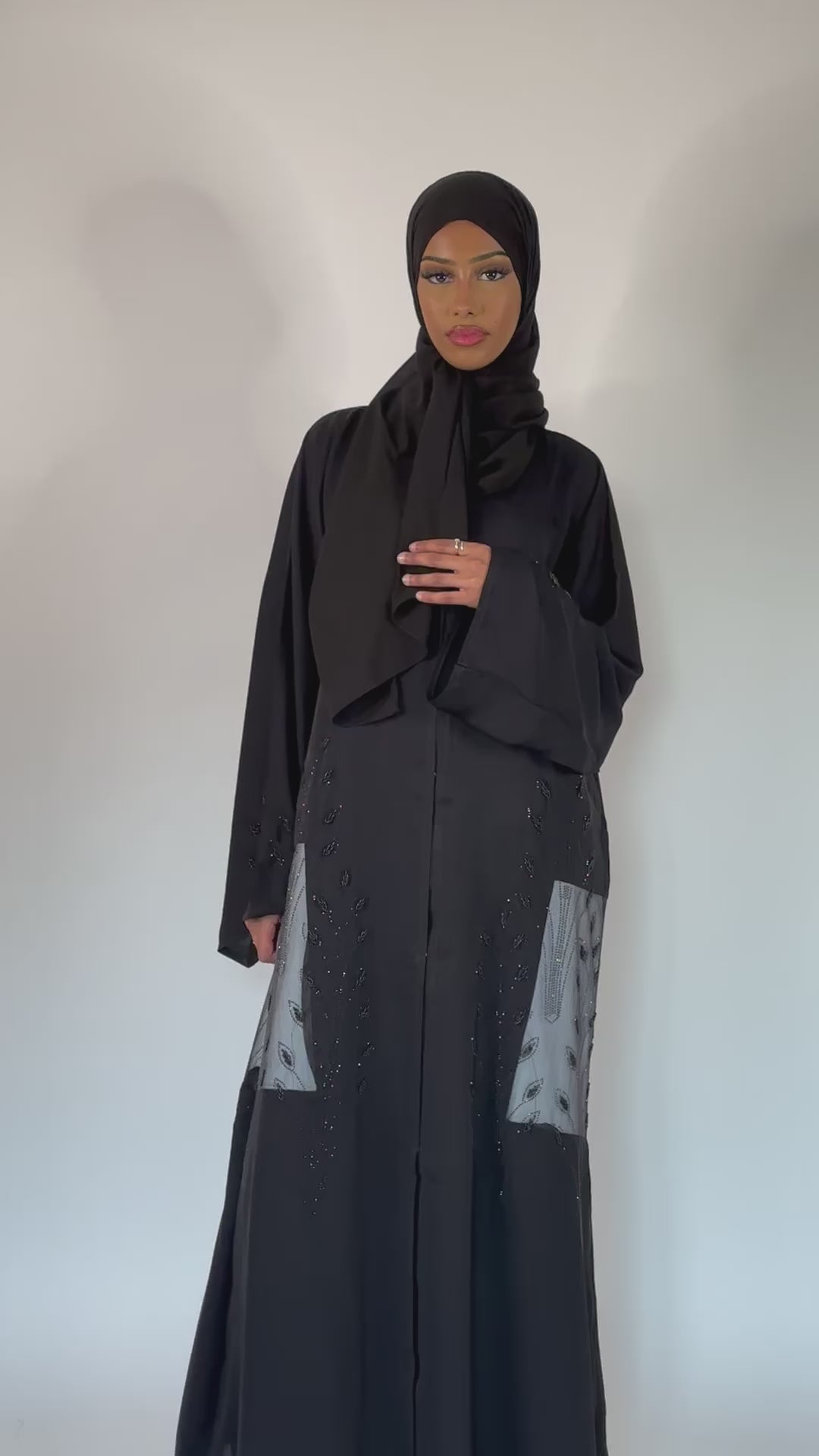 Extremely eye catching and glamorous addition to your Black abaya collection.