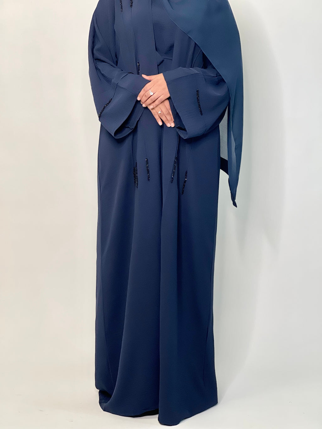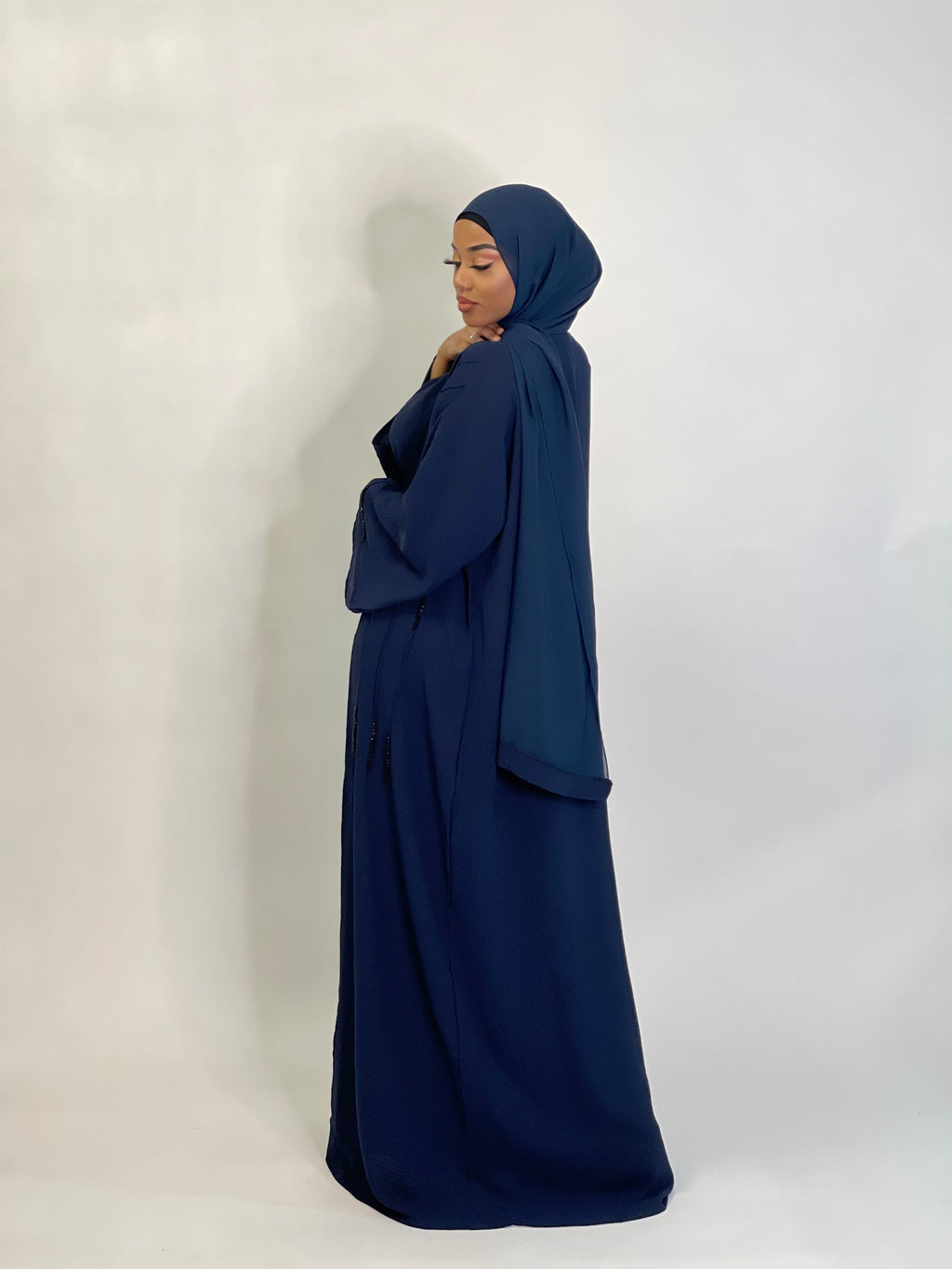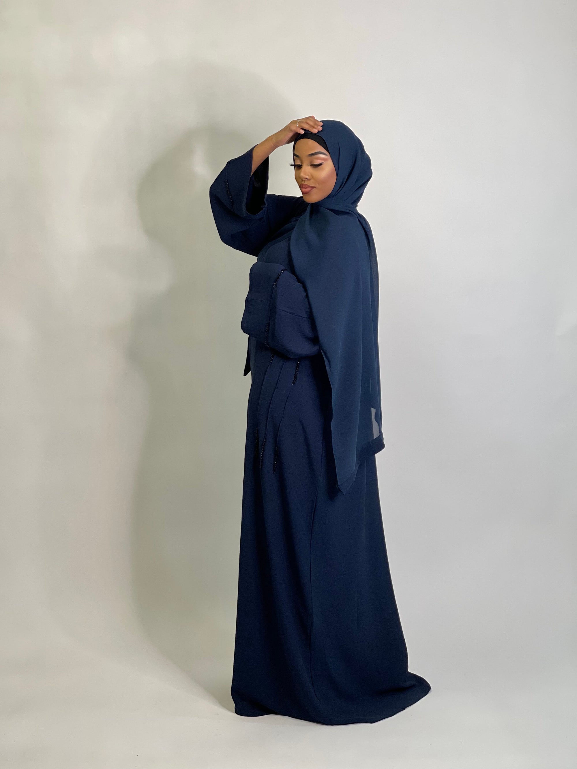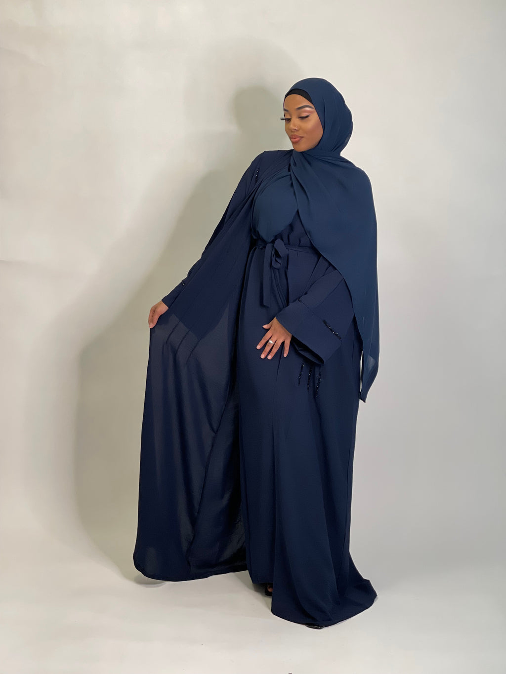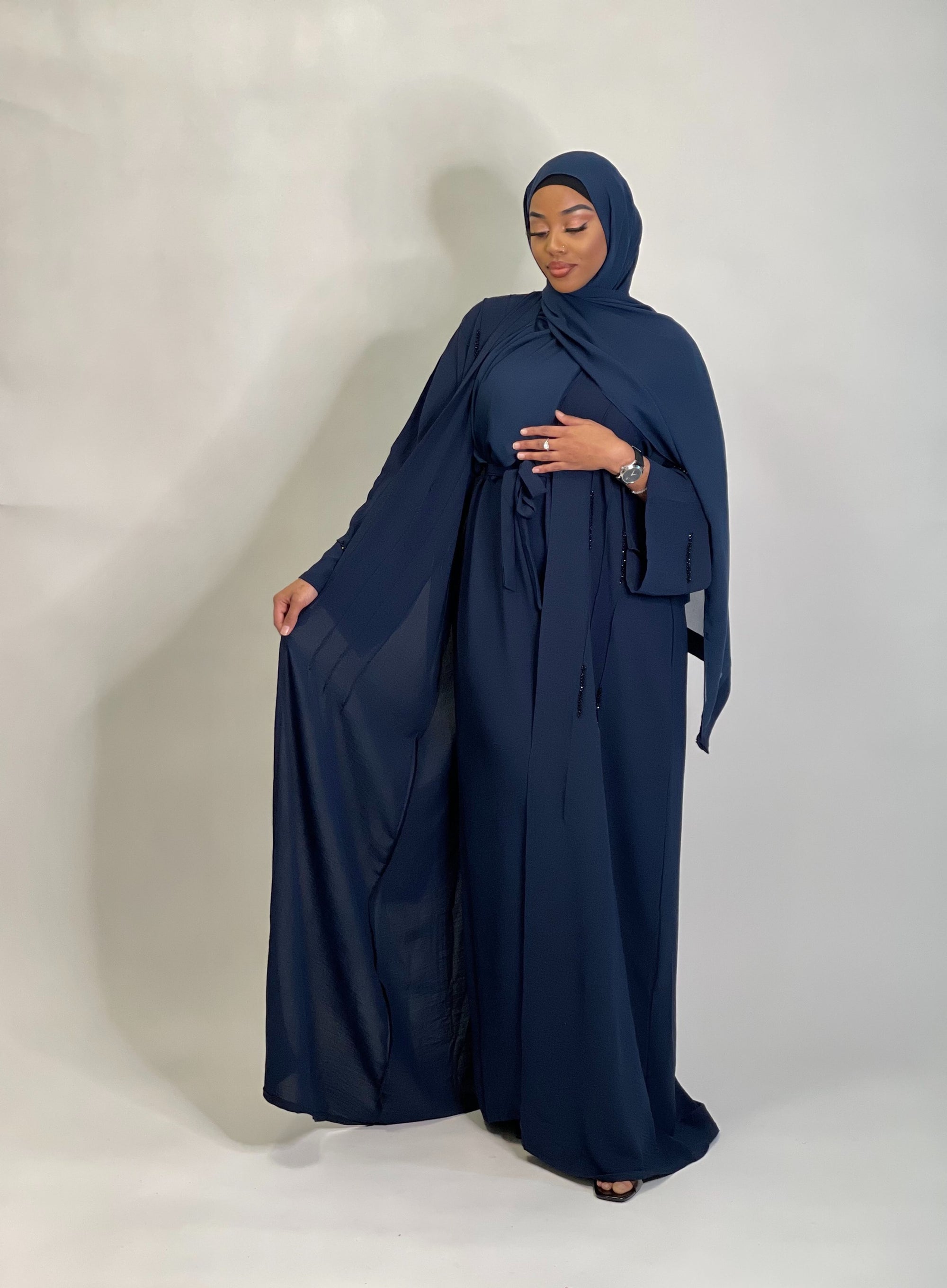 Your wardrobes favourite 3 peice navy blue abaya with matching slip dress.