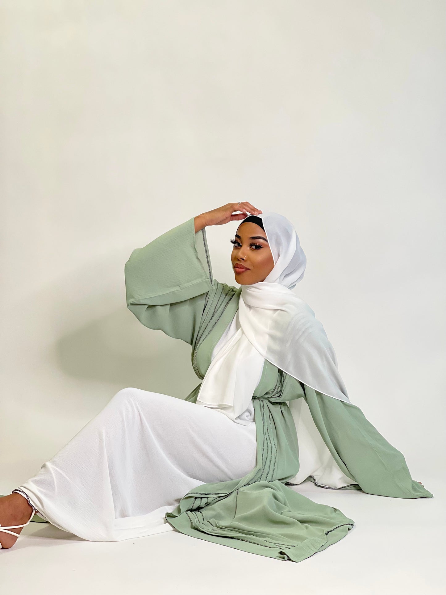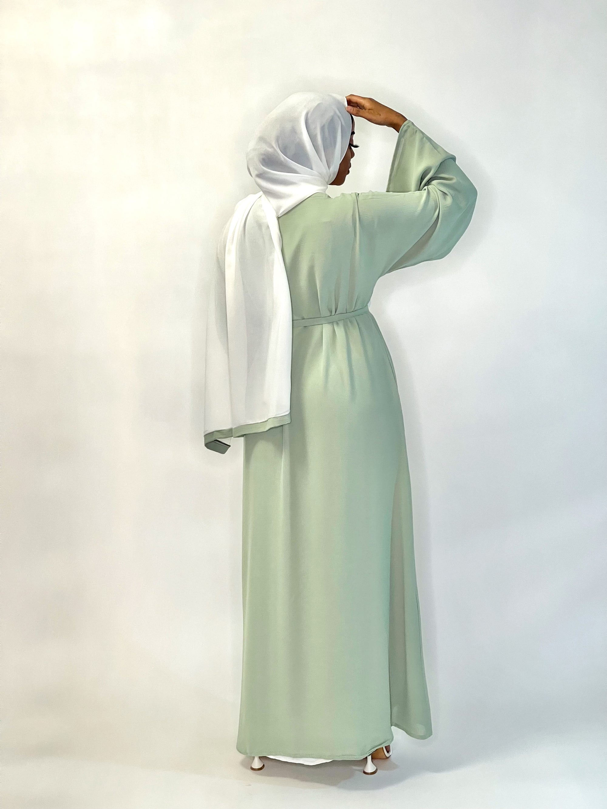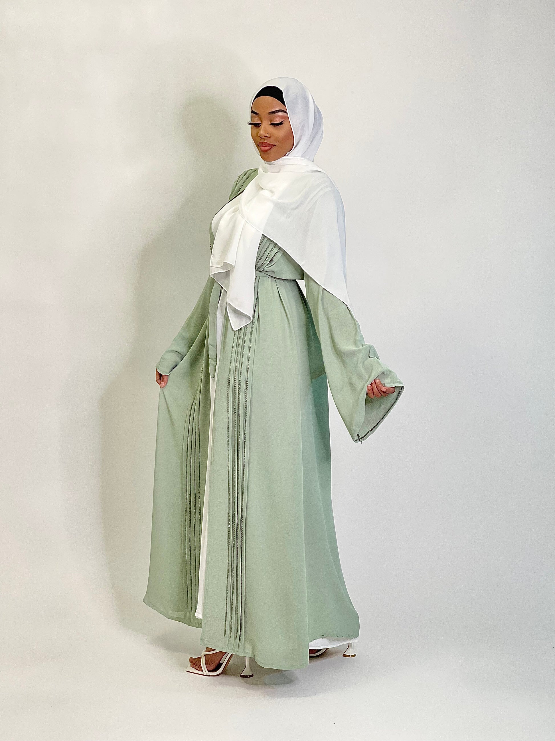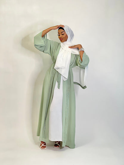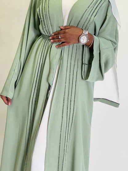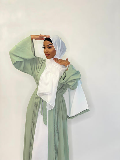 Your wardrobes favourite 3 peice light green abaya with green embroidery going down the front of the abaya.