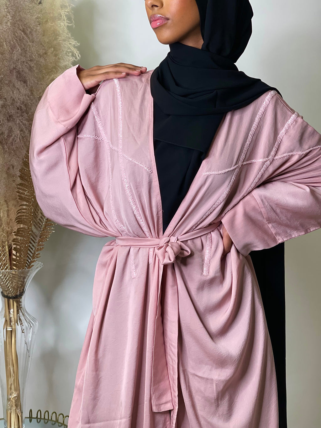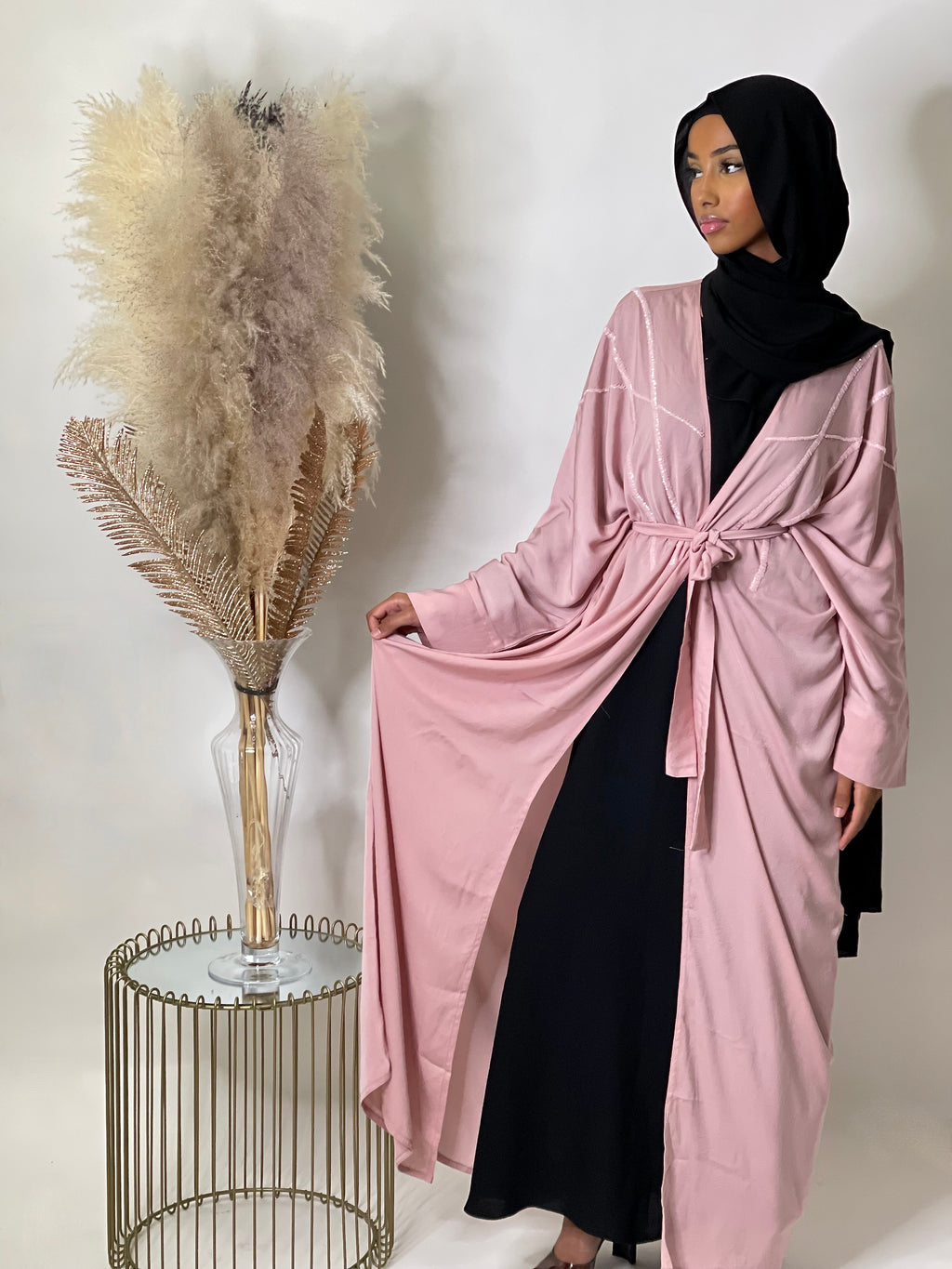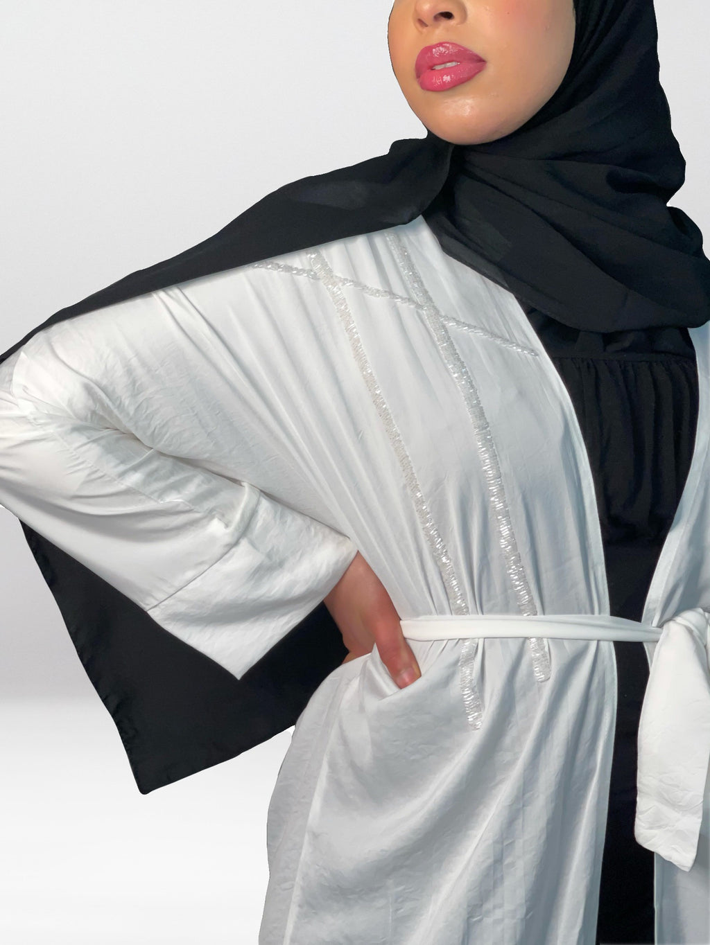 This collection features the silver on black, pink on pink as well as the white on white linen abayas. Perfect for summer weather. Its light to wear and flowy for comfort and stunning pictures.