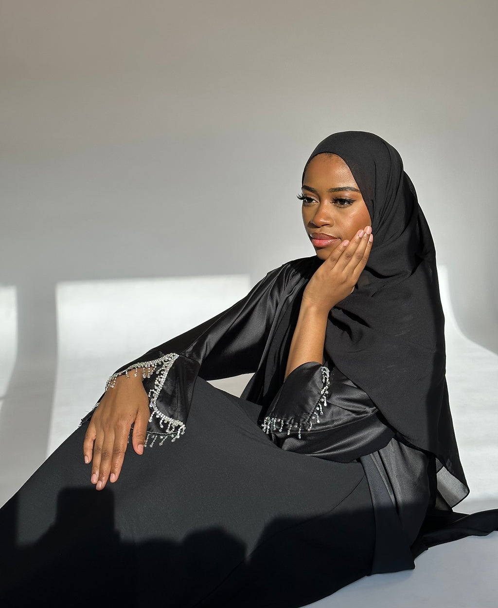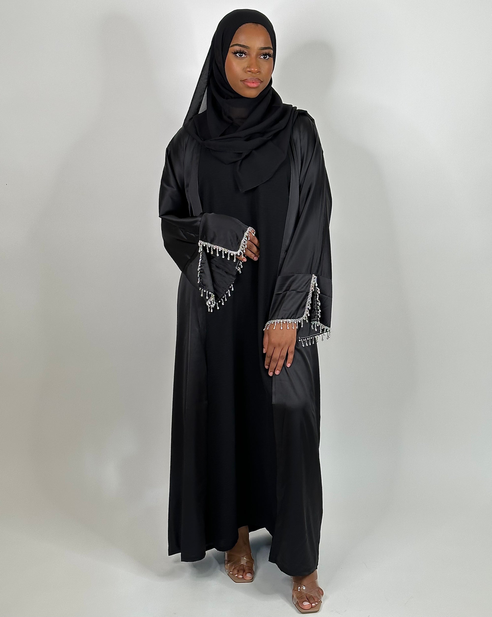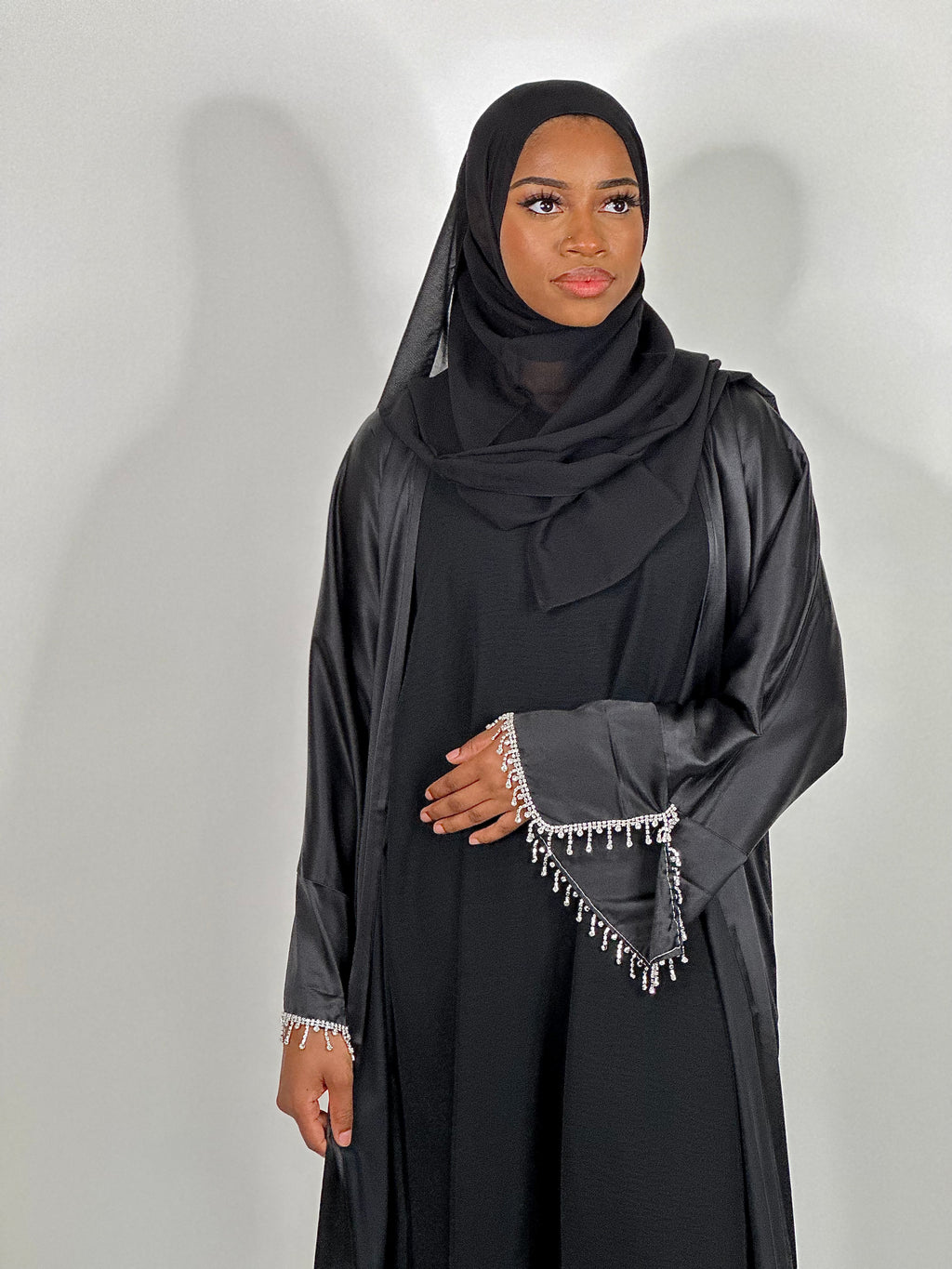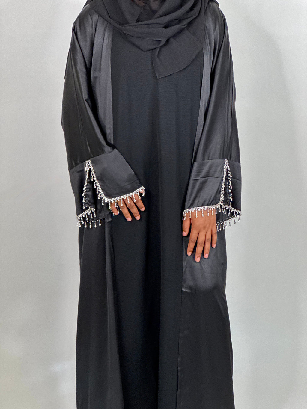 Stunning new black abaya made with pure satin, a unique and intricate split wrist designed with the finest silver diamonds to give you the simple yet extravagant factor.