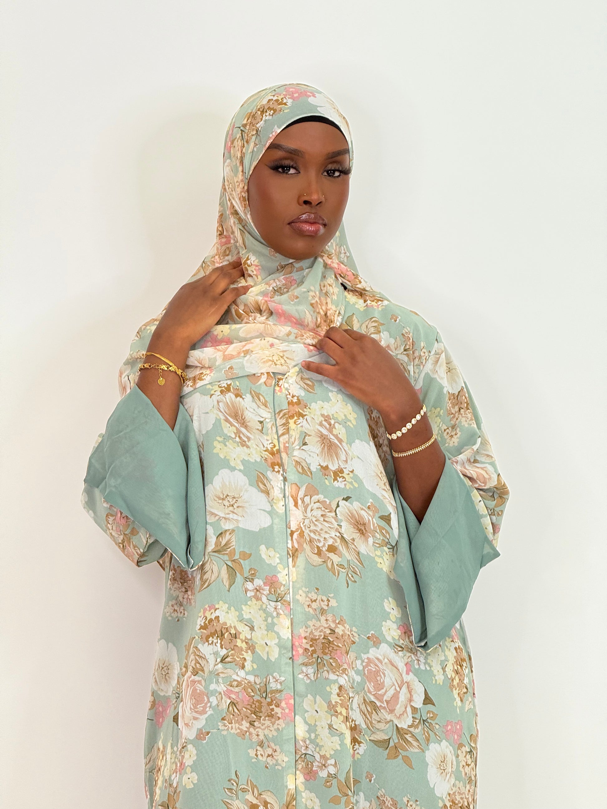 Exclusive all shades of green with a hint of pink and cream, light and airy printed abaya.