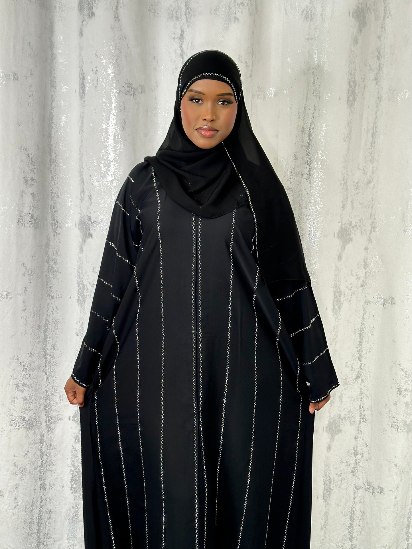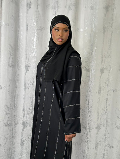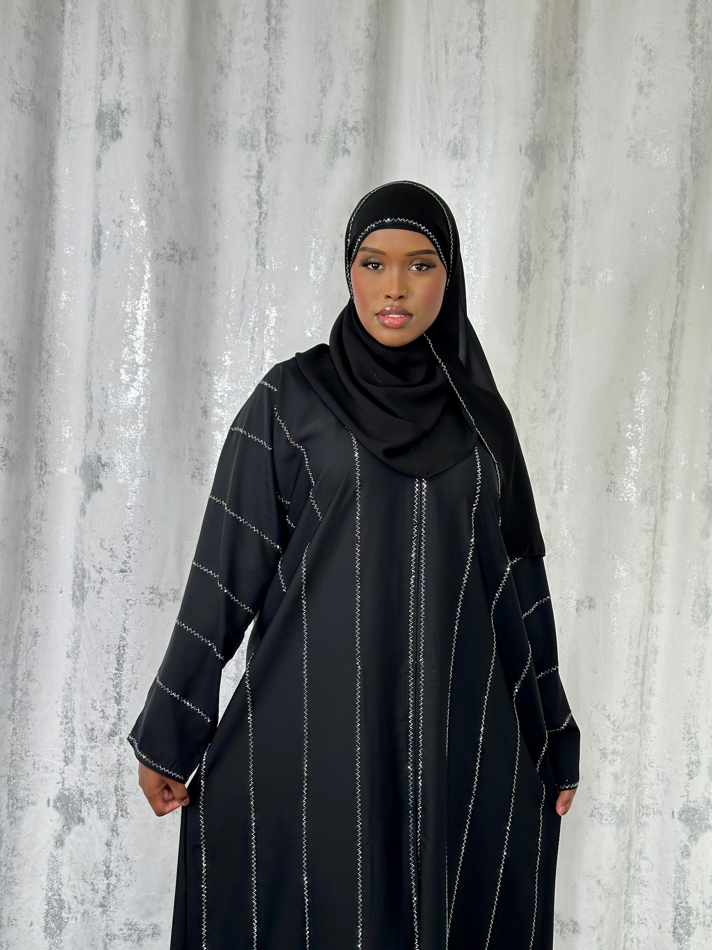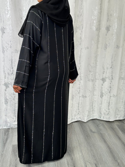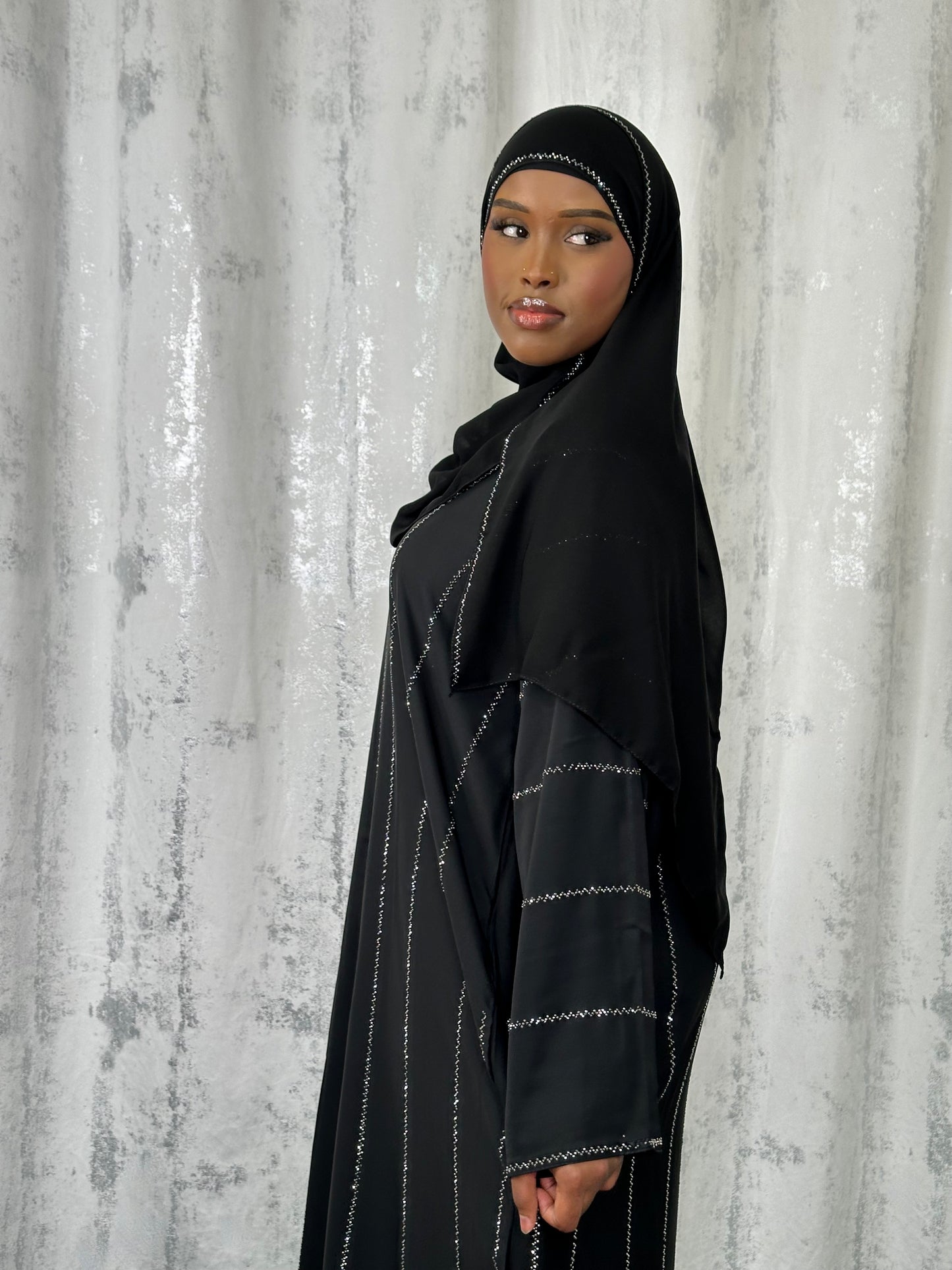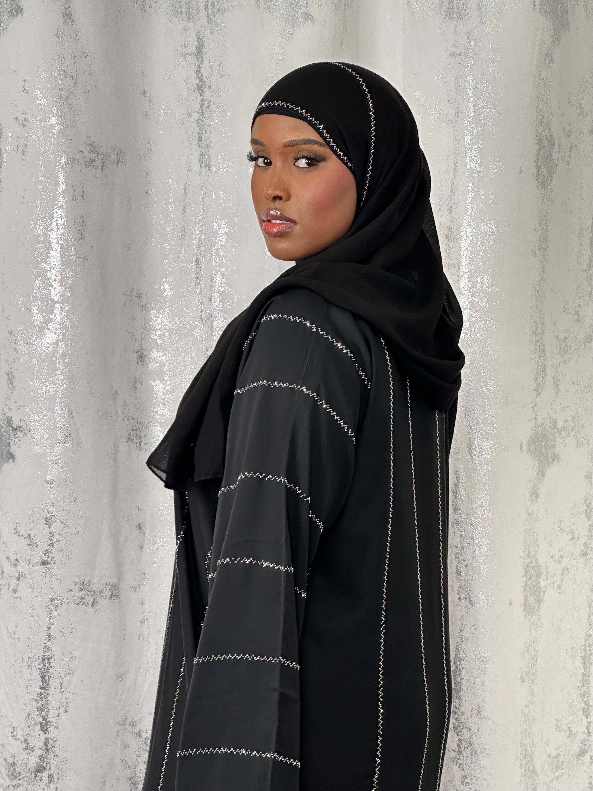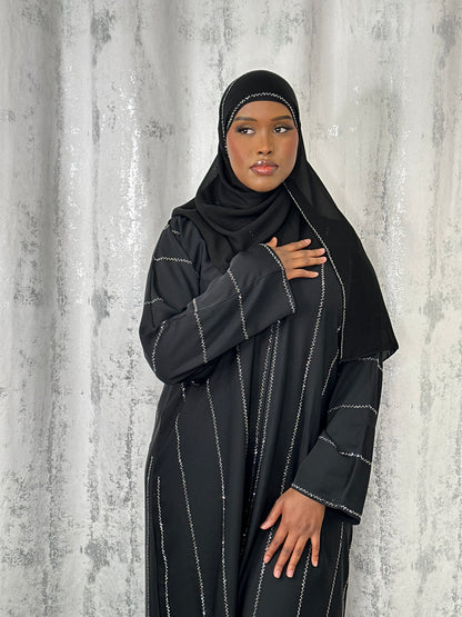 Beautiful open black abaya with intricate silver design to catch your eye from every angle. Designed from front to back. Perfect for summer and spring.