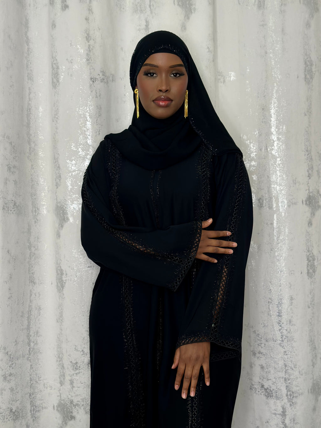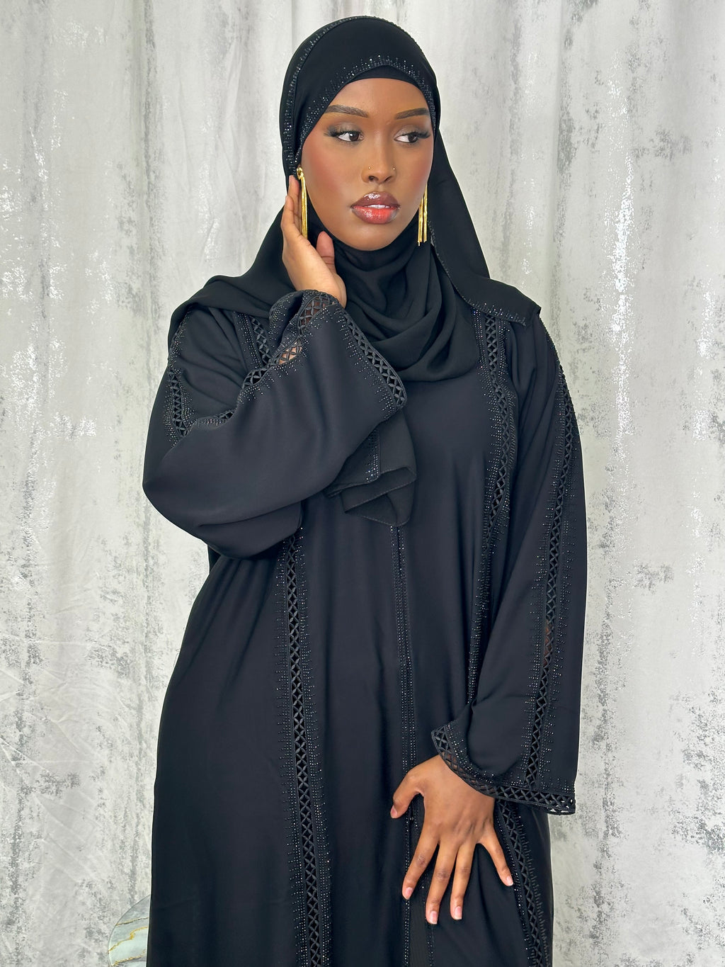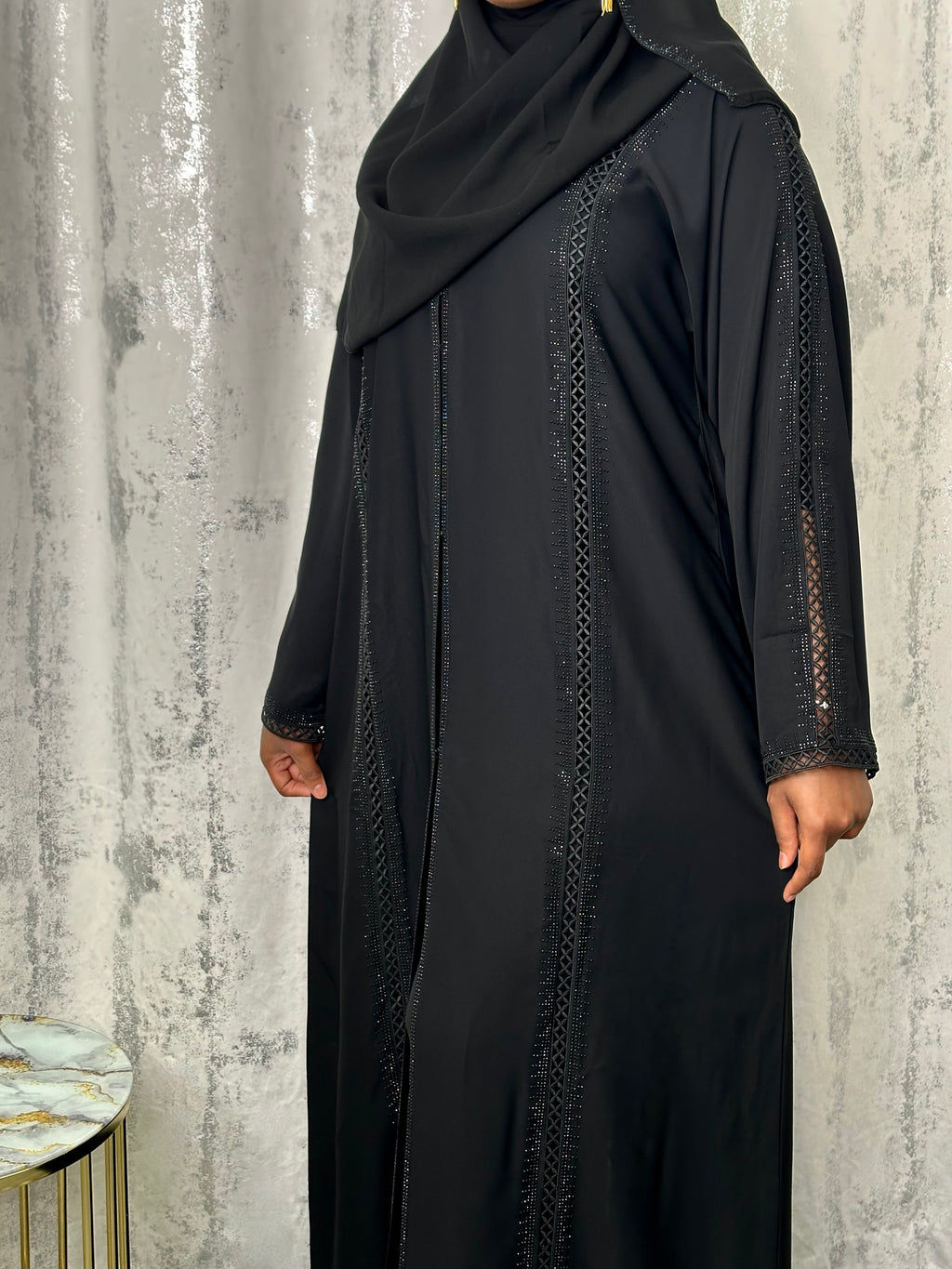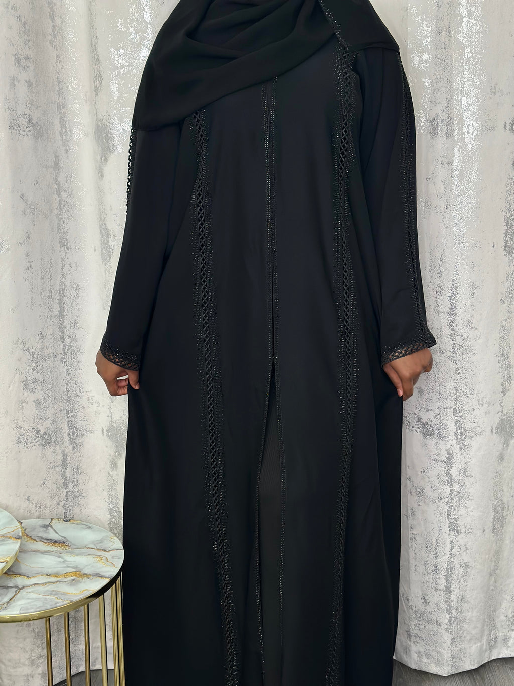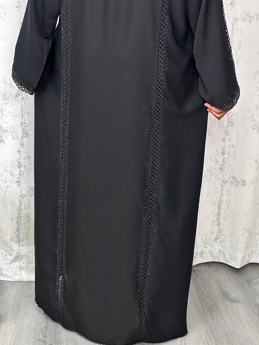 Beautiful open black abaya with intricate bllack lace and bead design to catch your eye from every angle. Perfect for summer and spring.