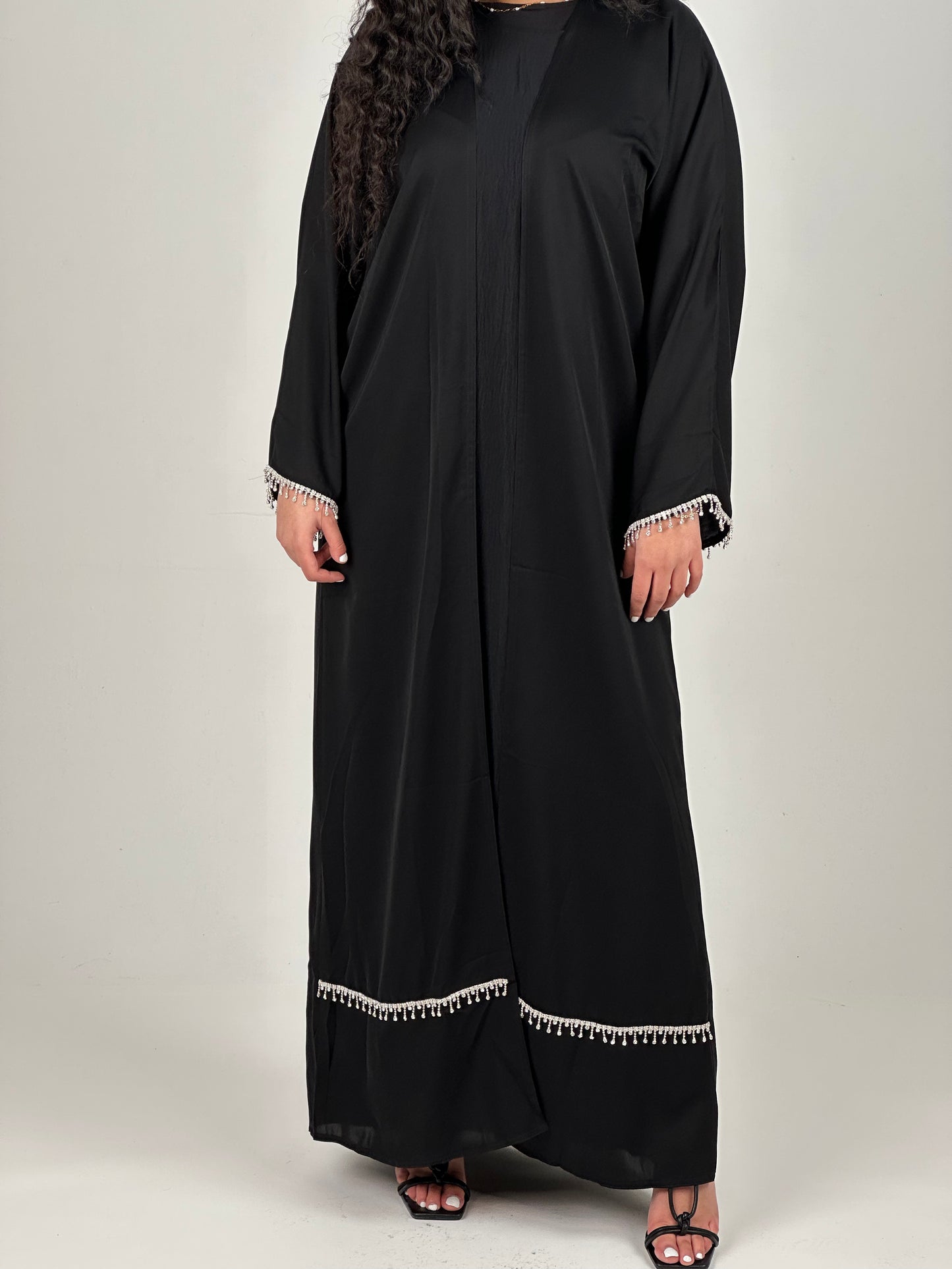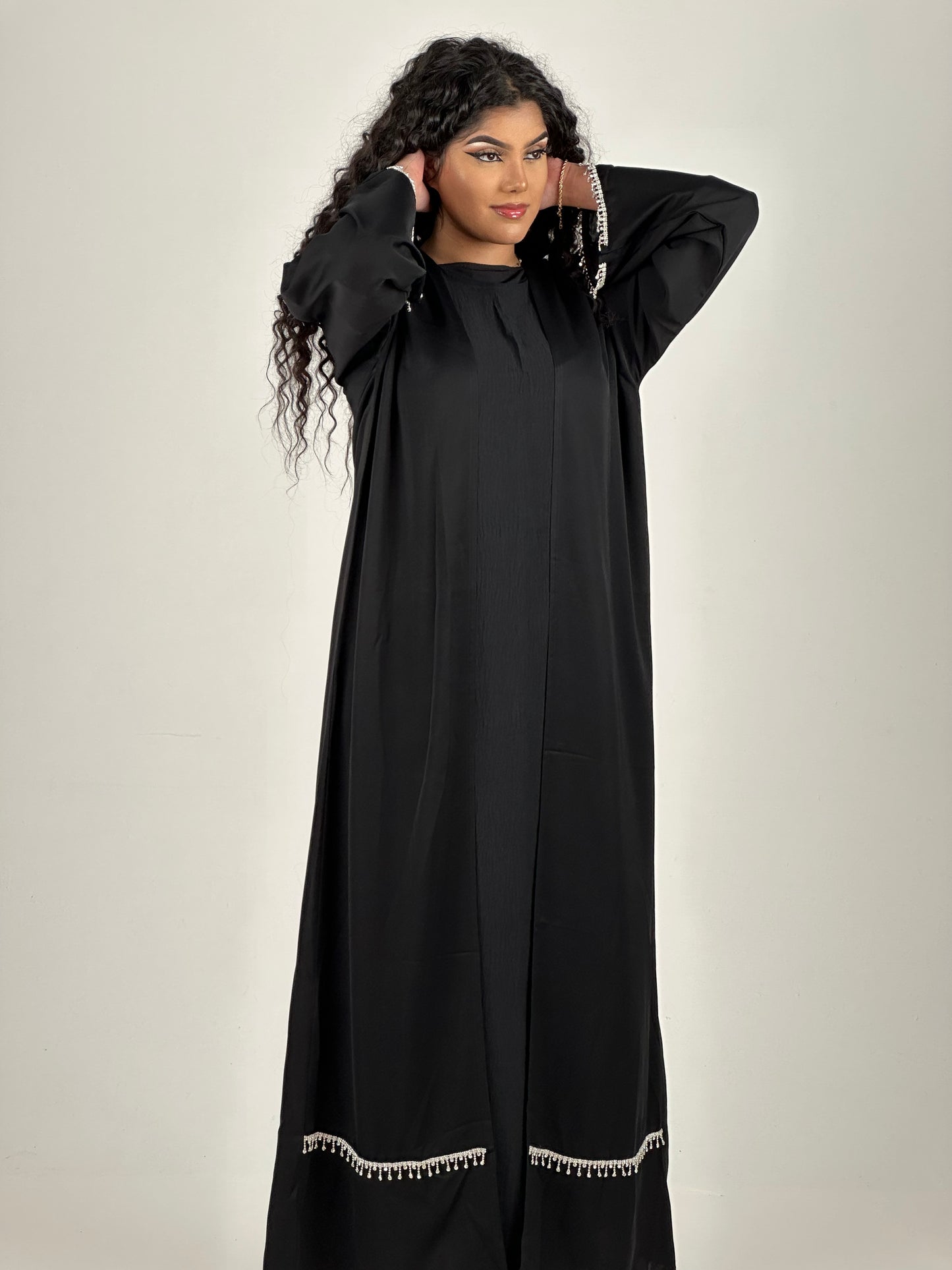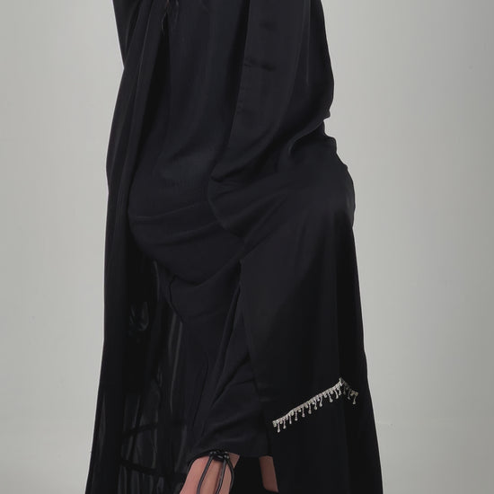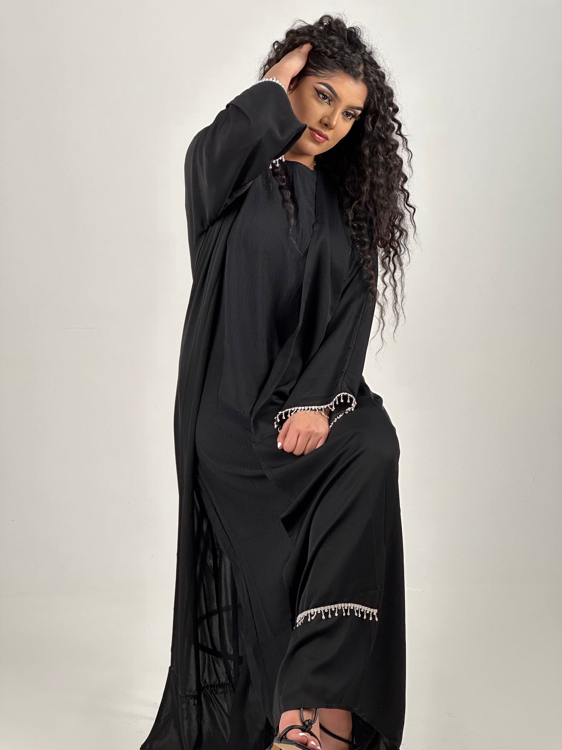 Simple black abaya with an extravagant & eye catching silver design on the hands as well as lower length of the abaya for a unique touch.