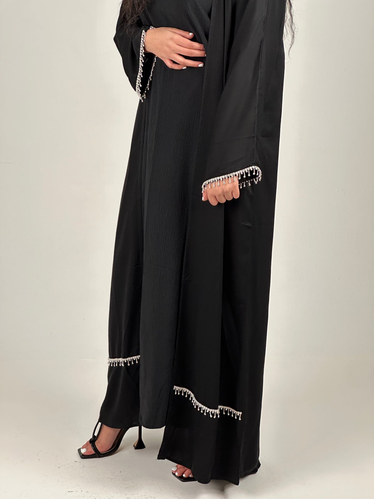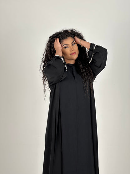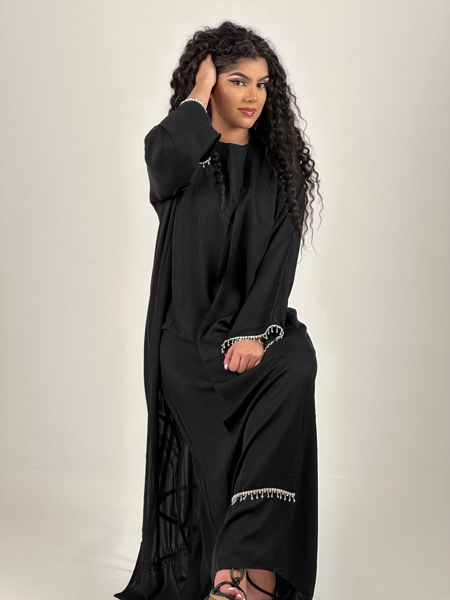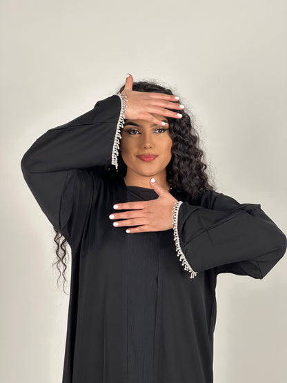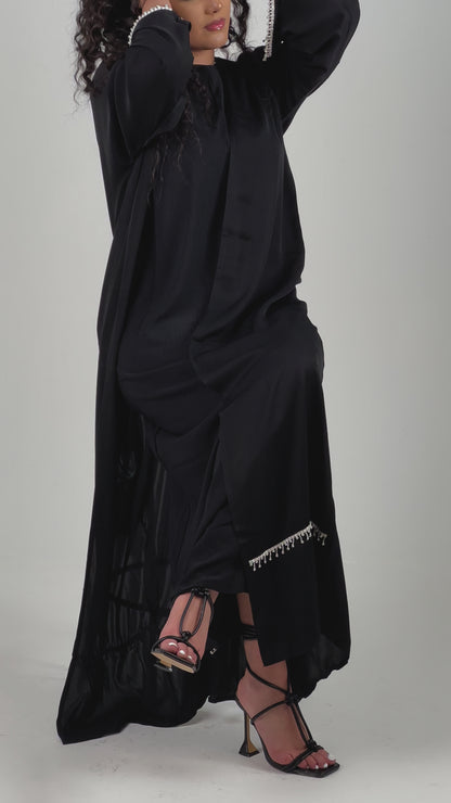 Simple black abaya with an extravagant & eye catching silver design on the hands as well as lower length of the abaya for a unique touch.